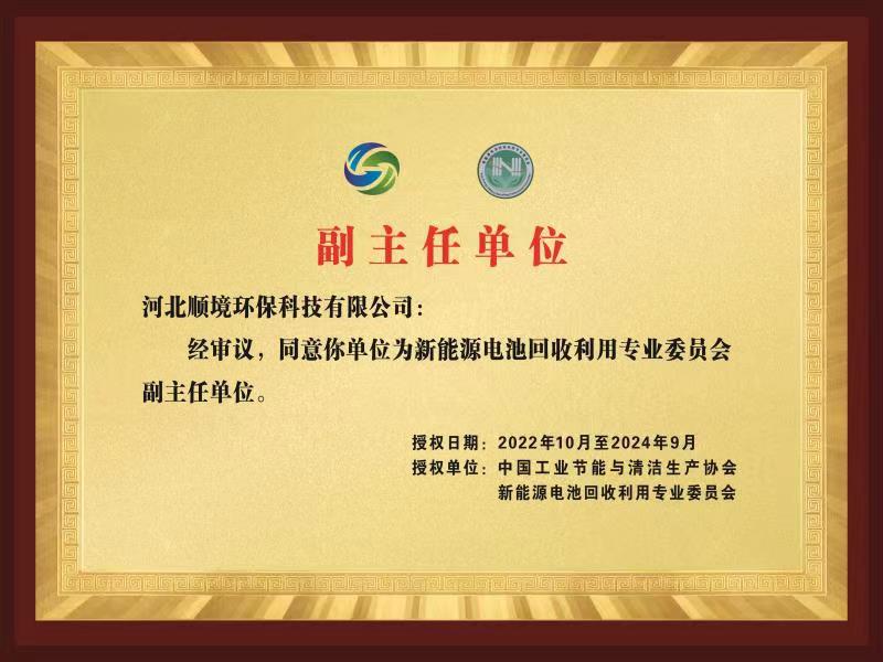 2022年10月河北顺境环保科技有限公司被中国工业节能与清洁生产协会,新能源电池回收专业委员共同认定为副主任单位